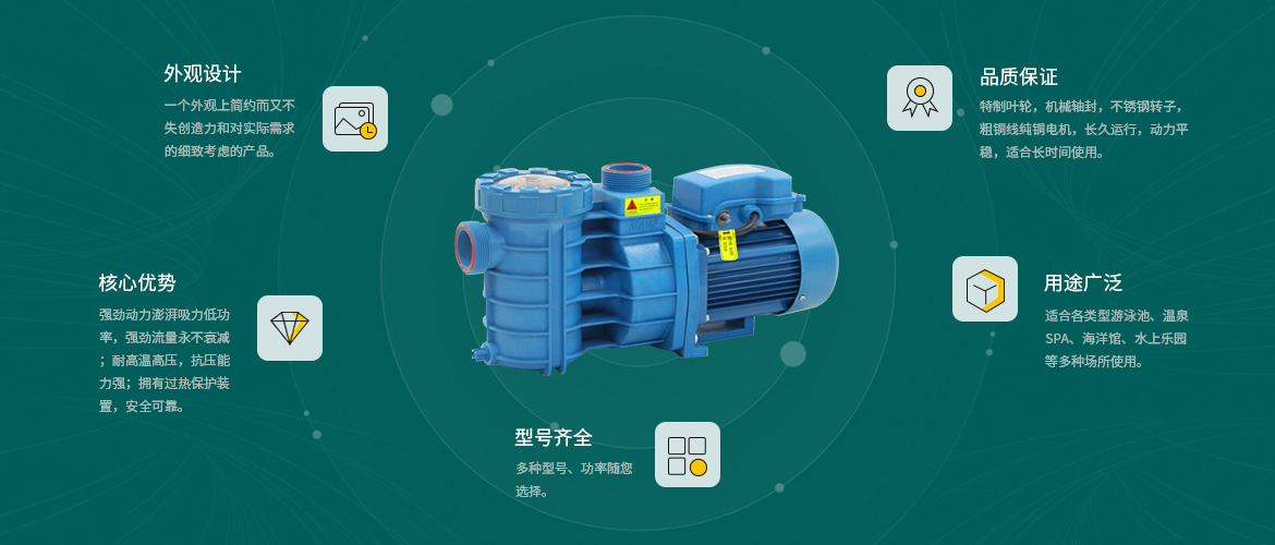 ABS系列水泵,內(nèi)部創(chuàng)新設(shè)計,自吸力大,泵體由特種材料制作而成,可以承壓6kg/cm2,可用于70℃高溫,是泳池、溫泉SPA、海洋館、水上樂園等場所使用。