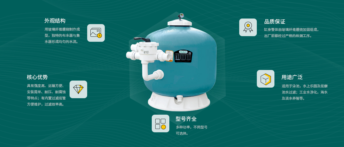 AQUA愛克過濾砂缸承受溫度可達45℃;具有耐高溫、耐腐蝕、抗老化,操作簡單、精密過濾、堅固耐用等諸多優點,是品質十分優良的泳池設備。