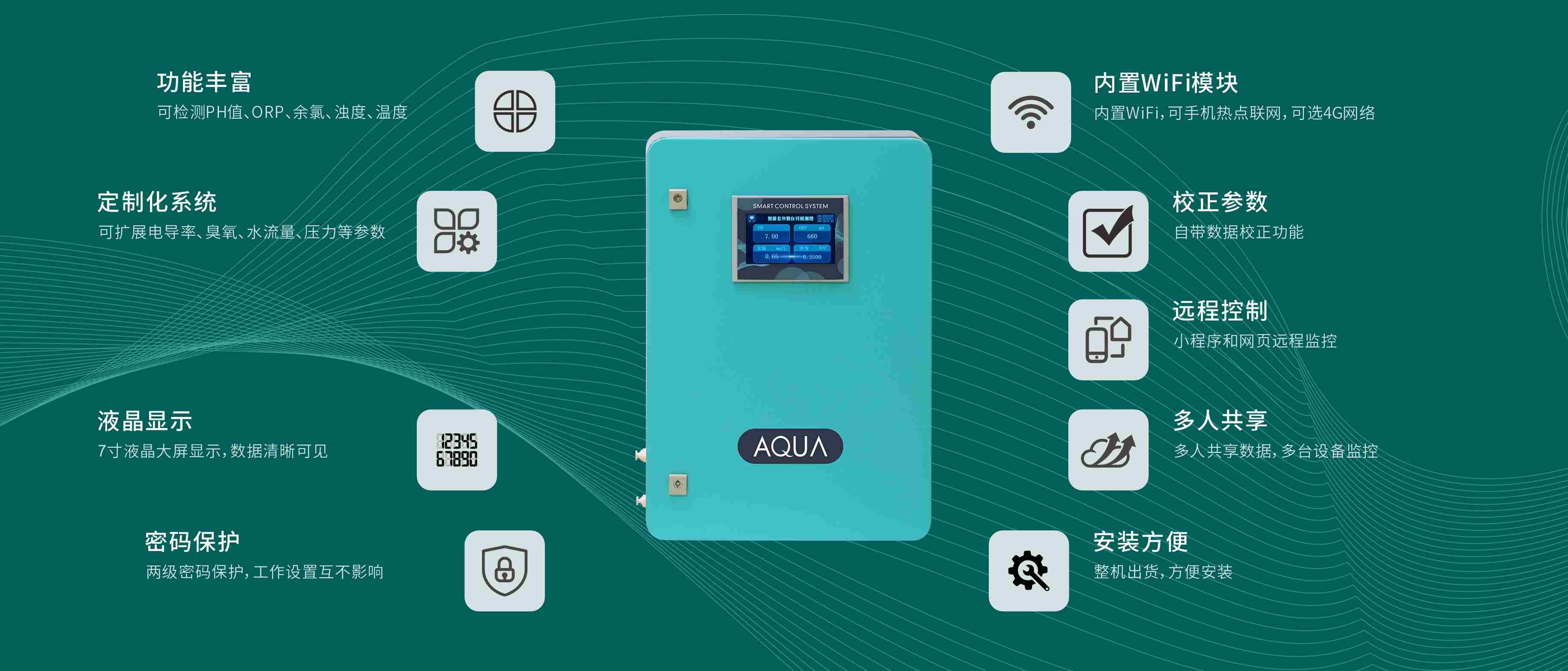 AQUA愛克泳池設備旗下水質監控儀(AUT-3000)具有自動監測、記錄存儲、傳送數據到數據監控平臺,多人共享數據及一人多臺設備監控;數據監控平臺,可遠程查看分析數據;可監測PH值、ORP、CL、濁度、溫度等多項參數。