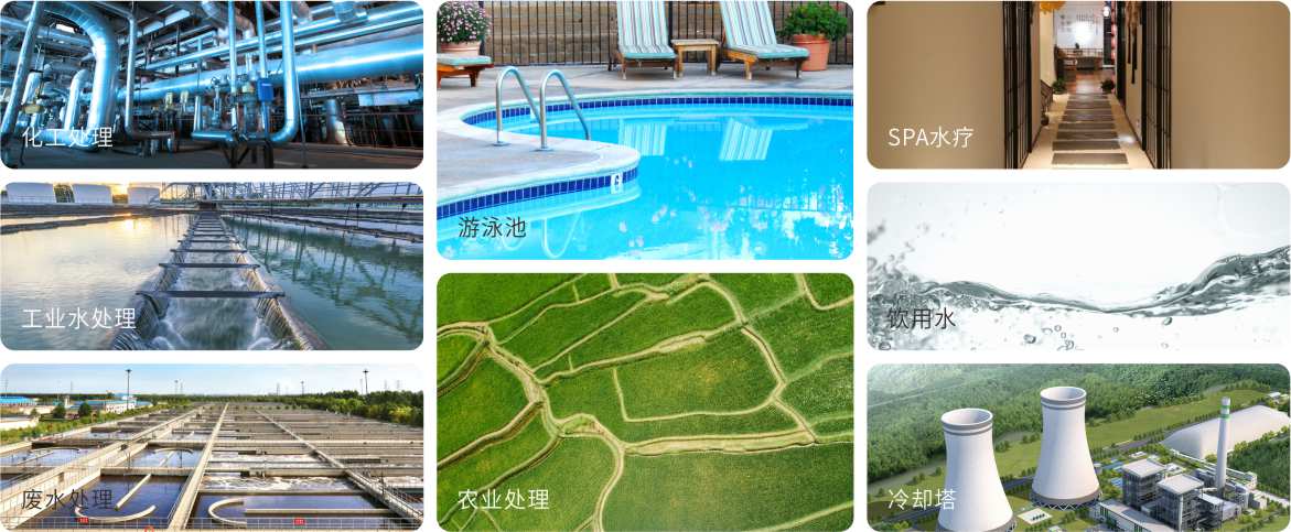用于各類型泳池、SPA水療、工業(yè)水處理、冷卻塔、飲用水、廢水處理、農(nóng)業(yè)等水處理領(lǐng)域。