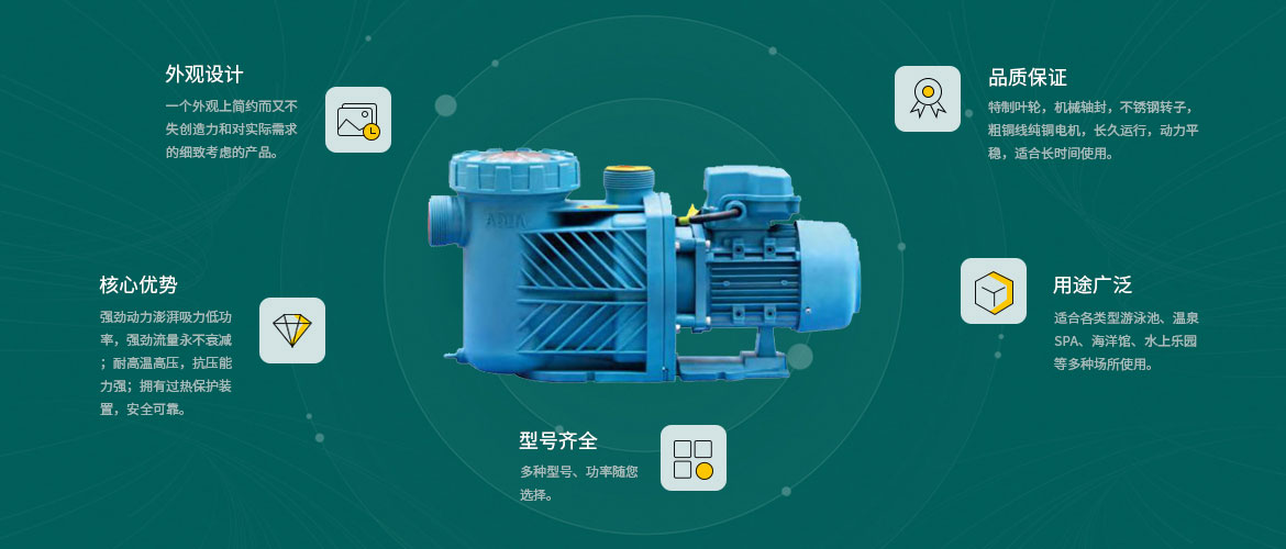 AQUA愛(ài)克泳池設(shè)備旗下的泳池循環(huán)水泵水泵適用于70℃的溫泉,承壓可達(dá)6kg/cm2,是適合各類(lèi)型游泳池、溫泉SPA、海洋館等多種場(chǎng)所使用的水泵泳池設(shè)備。