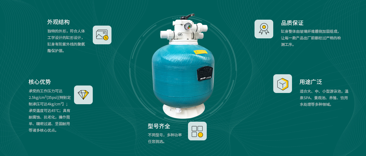 AQUA愛克過濾砂缸承受溫度可達45℃;具有耐高溫、耐腐蝕、抗老化,操作簡單、精密過濾、堅固耐用等諸多優點,是品質十分優良的泳池設備。
