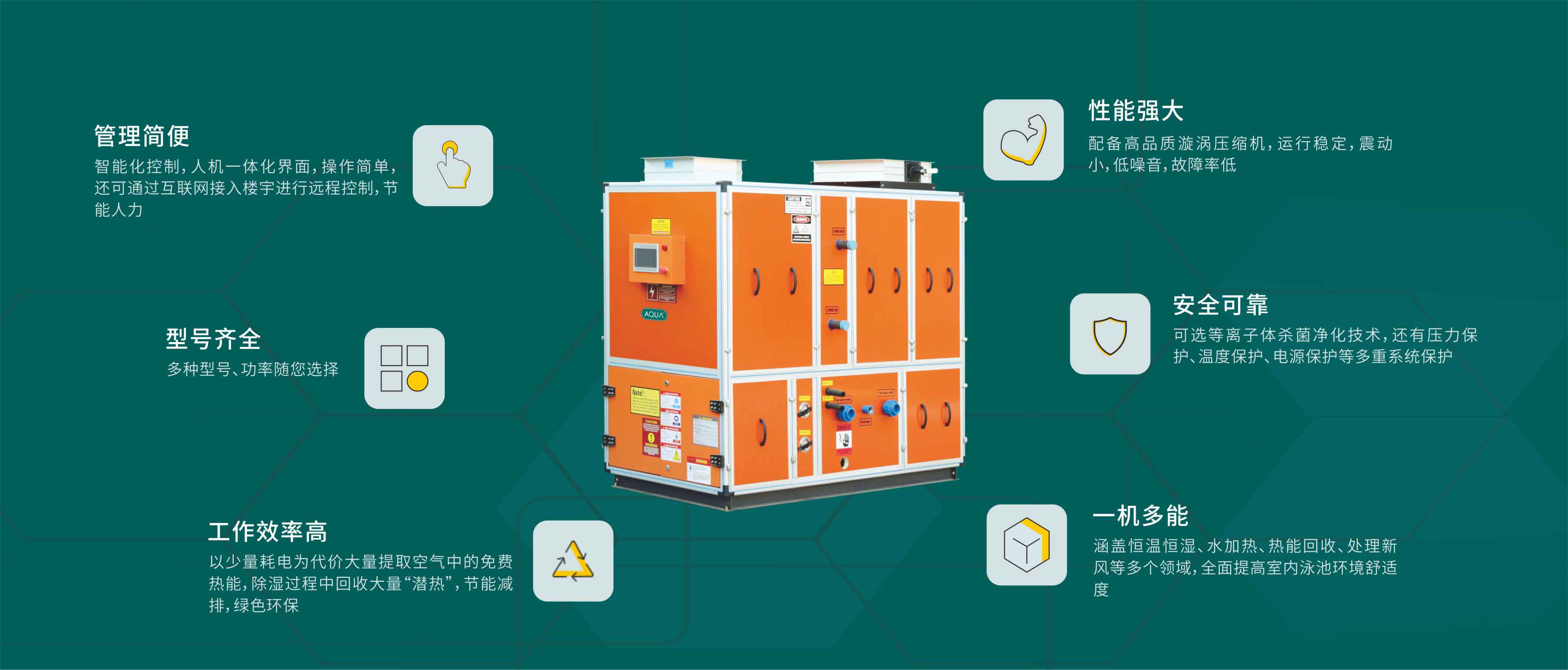 AQUA愛克泳池設備旗下的除濕熱泵系列集空調、除濕和池水加熱于一體,大量回收并綜合利用能量,克服高濕、高氯環境等諸多問題,通過春夏秋冬季節運行模式的改變,達到高效率、節能環保的運行,是一種十分環保節能的泳池設備產品。