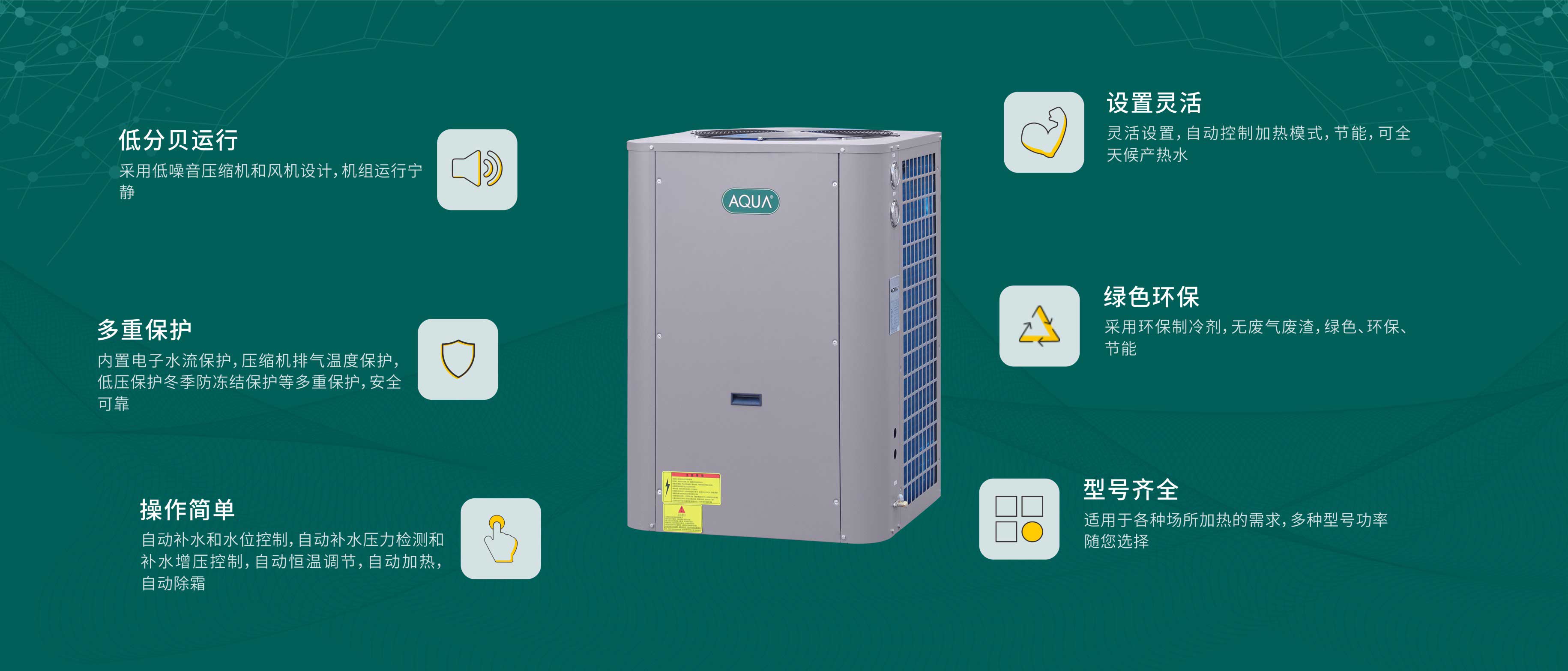 AQUA愛(ài)克泳池設(shè)備旗下恒溫?zé)岜貌捎玫驮胍魤嚎s機(jī)和風(fēng)機(jī)設(shè)計(jì),機(jī)組運(yùn)行寧?kù)o。